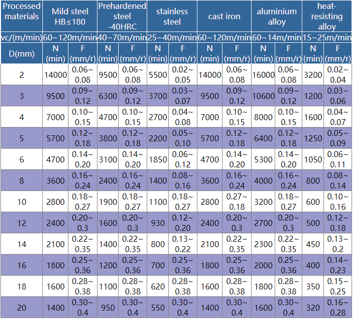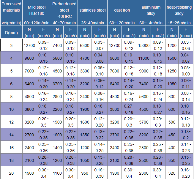 - The cutting conditions in this table are applicable to situations with hole depth below 5D
