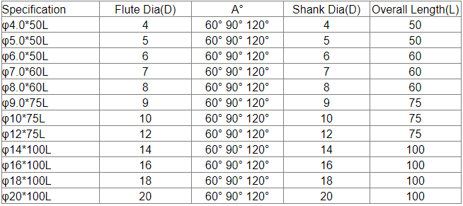 If the following carbide end mill cannot meet your requirements, we support OEM customized production. The diameter of 0.2mm to 25mm, the total length of 50mm to 200mm, 4F, 5F, 6F, 8F and logo can be customized, including inch size end milling cutter. Please contact us to select or customize non-standard carbide end mill according to your needs.