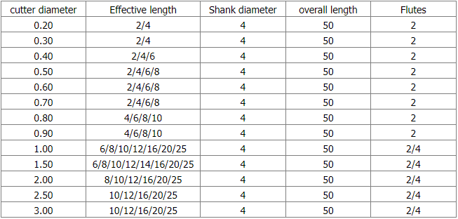 If the following carbide micro diameter aluminum flat milling cutter cannot meet your requirements, we support OEM customized production. The diameter of 0.2mm to 25mm, the total length of 50mm to 200mm, 4F, 5F, 6F, 8F and logo can be customized, including inch size end milling cutter. Please contact us to select or customize non-standard carbide end mill according to your needs.