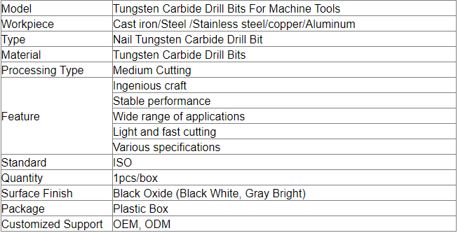 The tungsten carbide drill bits is made of fine particle tungsten steel bar with high hardness, sharp edge and longer service life; Large core diameter design is adopted to give consideration to the strength and sharpness of the cutting edge, enhance the rigidity of the cutting tool, and achieve efficient cutting; The anti-seismic design of cutting edge improves the quality of machined surface; The spiral angle is designed to increase the capacity of the chip discharge groove, which ensures smooth chip discharge without chip accumulation, and effectively prevents the generation of chip buildup; The specifications and models are complete, and non-standard customization is supported.