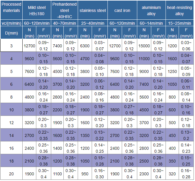 - The cutting conditions in this table are applicable to situations with hole depth below 5D