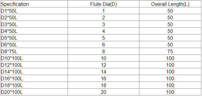 If the following carbide end mill cannot meet your requirements, we support OEM customized production. The diameter of 0.2mm to 25mm, the total length of 50mm to 200mm, 4F, 5F, 6F, 8F and logo can be customized, including inch size end milling cutter. Please contact us to select or customize non-standard carbide end mill according to your needs.