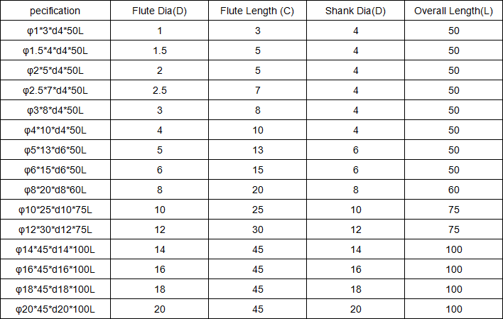 If the following carbide flat end mill cannot meet your requirements, we support OEM customized production. The diameter of 0.2mm to 25mm, the total length of 50mm to 200mm, 4F, 5F, 6F, 8F and logo can be customized, including inch size end milling cutter. Please contact us to select or customize non-standard carbide flat end mill according to your needs.
