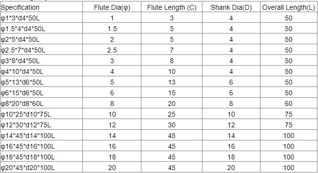 If the following carbide flat end mill cannot meet your requirements, we support OEM customized production. The diameter of 0.2mm to 25mm, the total length of 50mm to 200mm, 4F, 5F, 6F, 8F and logo can be customized, including inch size end milling cutter. Please contact us to select or customize non-standard carbide end mill according to your needs.