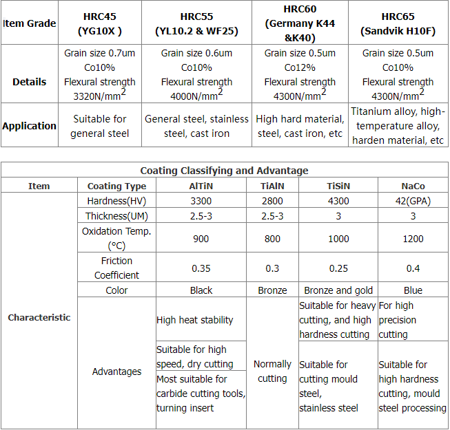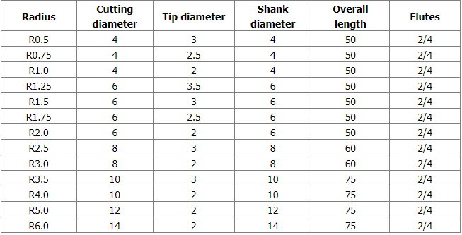 If the following carbide internal R milling cutter cannot meet your requirements, we support OEM customized production. The diameter of 0.2mm to 25mm, the total length of 50mm to 200mm, 4F, 5F, 6F, 8F and logo can be customized, including inch size end milling cutter. Please contact us to select or customize non-standard carbide end mill according to your needs.