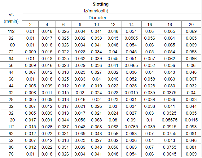 Milling Parameters of ball nose end mill: