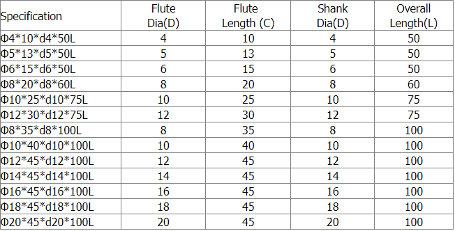 If the following carbide end mill cannot meet your requirements, we support OEM customized production. The diameter of 0.2mm to 25mm, the total length of 50mm to 200mm, 4F, 5F, 6F, 8F and logo can be customized, including inch size end milling cutter.