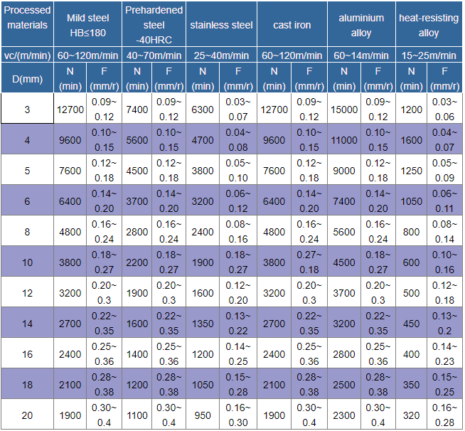- The cutting conditions in this table are applicable to situations with hole depth below 5D