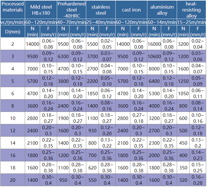 - The cutting conditions in this table are applicable to situations with hole depth below 5D