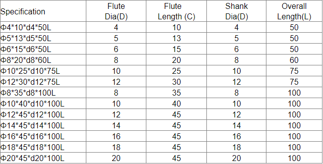 If the following carbide flat end mill cannot meet your requirements, we support OEM customized production. The diameter of 0.2mm to 25mm, the total length of 50mm to 200mm, 4F, 5F, 6F, 8F and logo can be customized, including inch size end milling cutter.