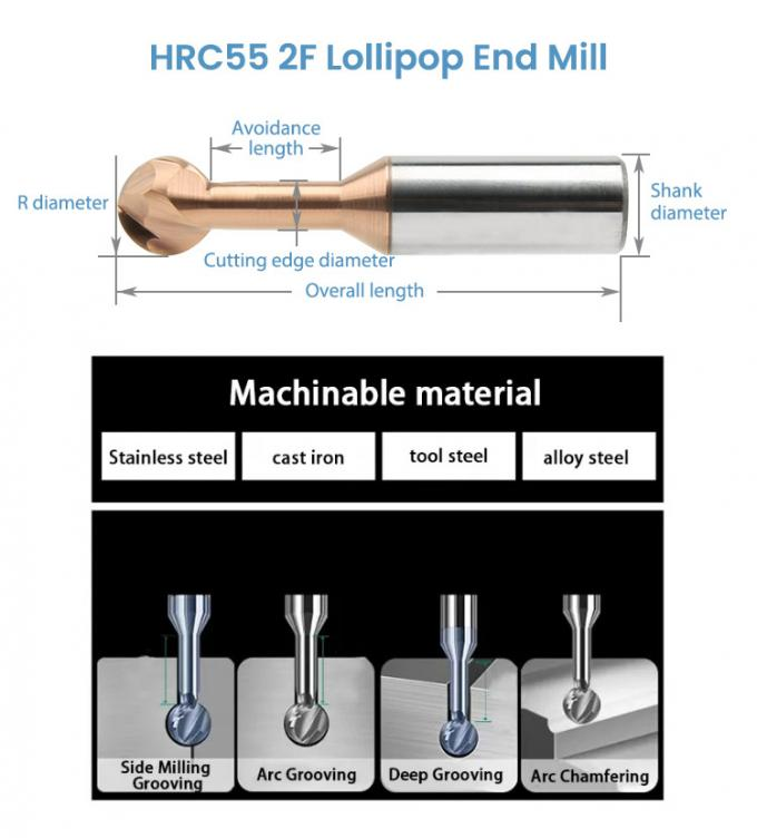 The overall alloy tungsten steel material ensures the stability and wear resistance of the HRC55 aluminum arch milling cutter, prolongs the tool’s service life, and improves efficiency; Fine grinding and passivation treatment of the cutting edge, excellent performance of the wide chip removal groove, good chip removal performance, effective prevention of chip residue, and high smoothness; Technological upgrade, excellent overall anti collapse performance, suitable for processing materials such as copper and aluminum.