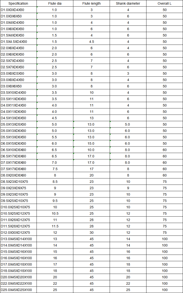 The following table lists the standard sizes of Dohre TEX series square end mill for stainless steel machining. We can also accpet custom size and shape according your request.